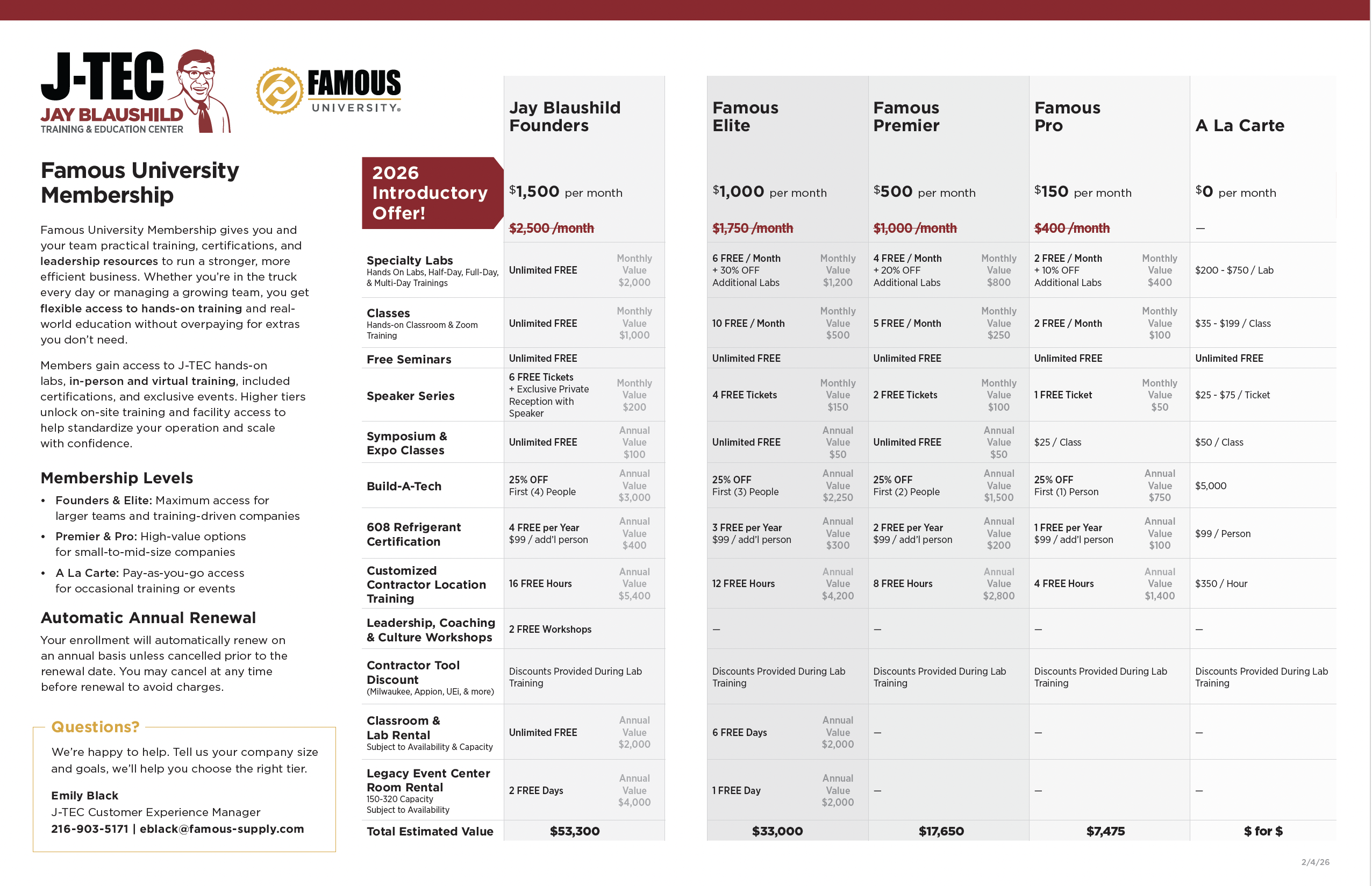 Famous University Membership gives you and your team practical training, certifications, and leadership resources to run a stronger, more efficient business. Whether you’re in the truck every day or managing a growing team, you get flexible access to hands-on training and realworld education without overpaying for extras you don’t need. Members gain access to J-TEC hands-on labs, in-person and virtual training, included certifications, and exclusive events. Higher tiers unlock on-site training and facility access to help standardize your operation and scale with confidence.